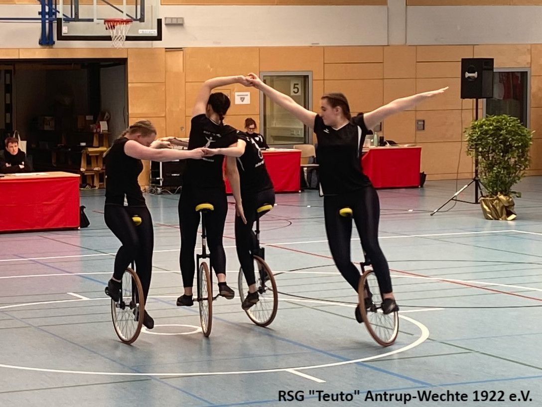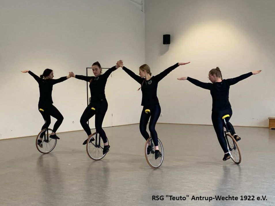 Lengerich - Mit einem großen Erfolg kehrten die Einradfahrerinnen der RSG „Teuto“ Antrup-Wechte von der NRW-Landesmeisterschaft der Junioren und Elite im Kunst- und Einradsport aus Mönchengladbach zurück. Sowohl im Sechser- wie auch im Vierer-Einradfahren der Junioren sicherten sich die Mädels die Goldmedaille. Im 6er Einradfahren der Elite durften Sie sich ebenfalls über die Goldmedaille freuen. Lediglich im 4er Einrad der Elite musste sich die RSG mit den Plätzen 2 und 3 zufrieden geben.