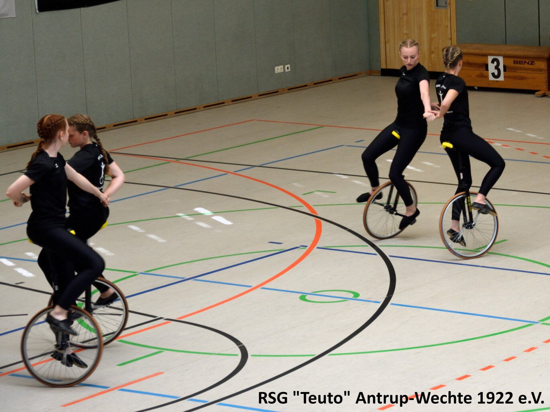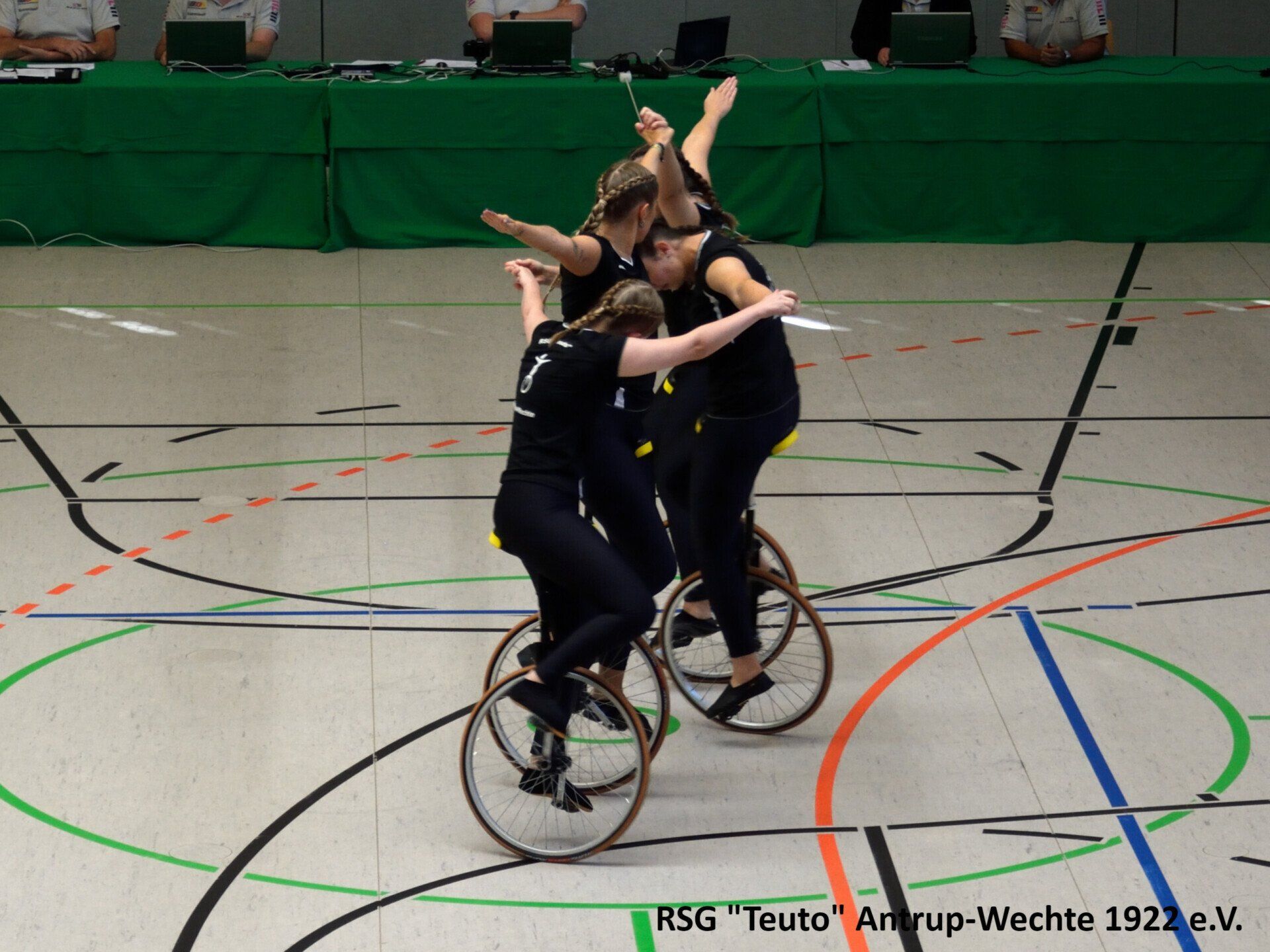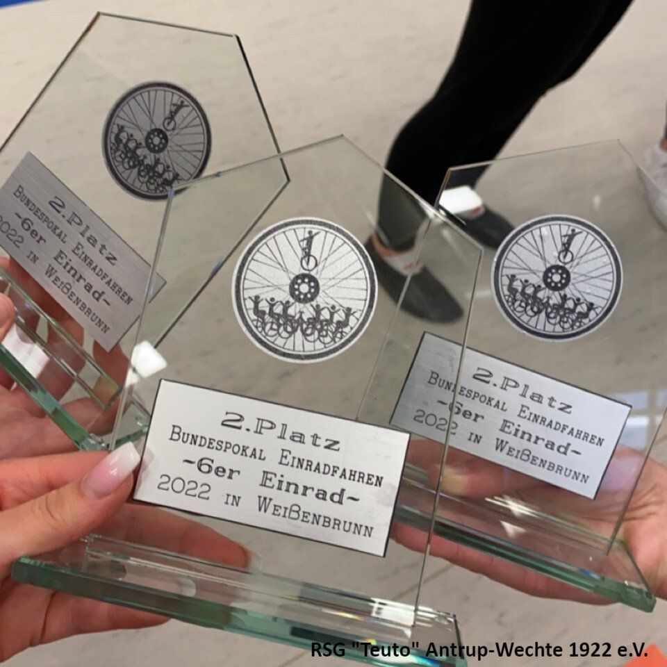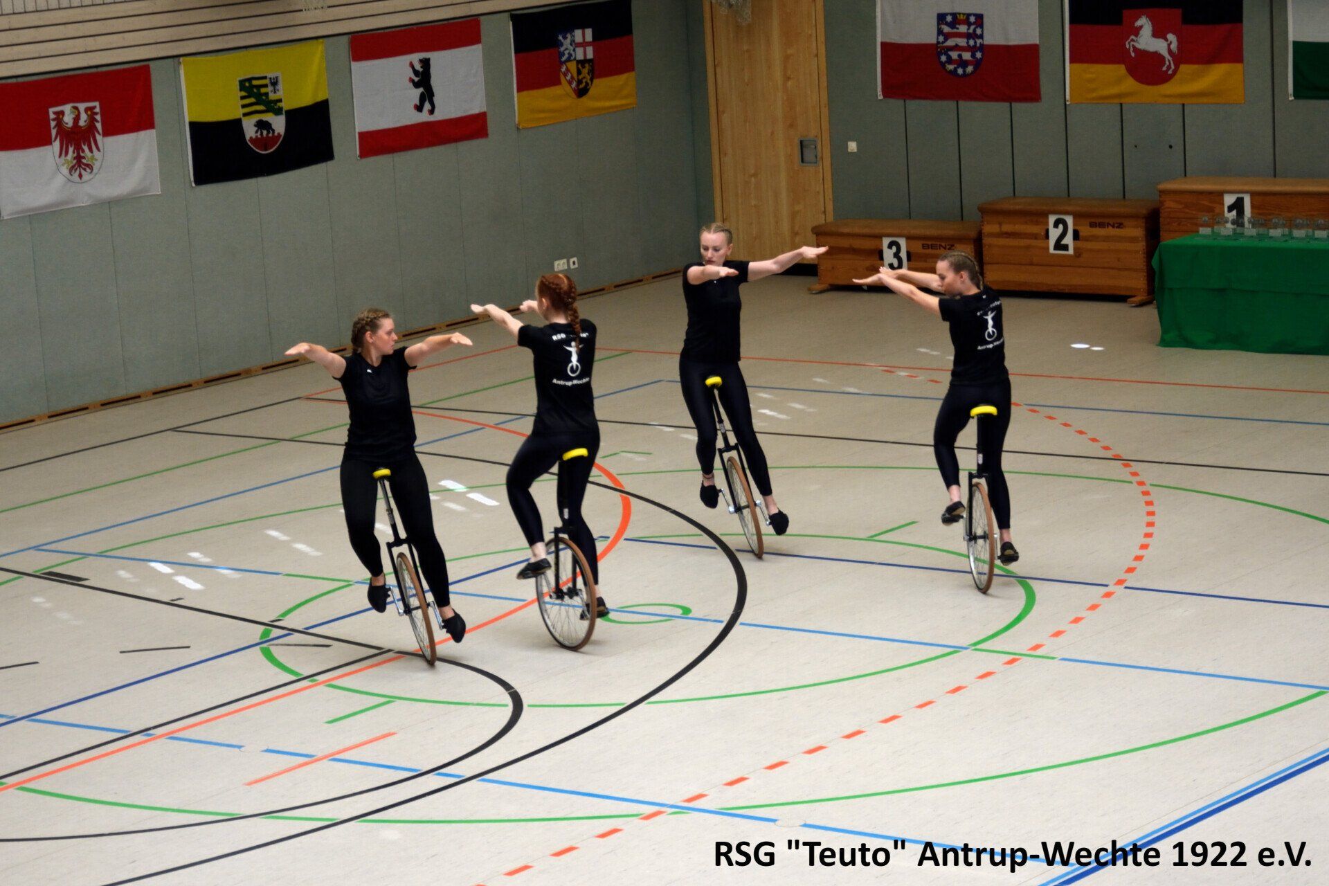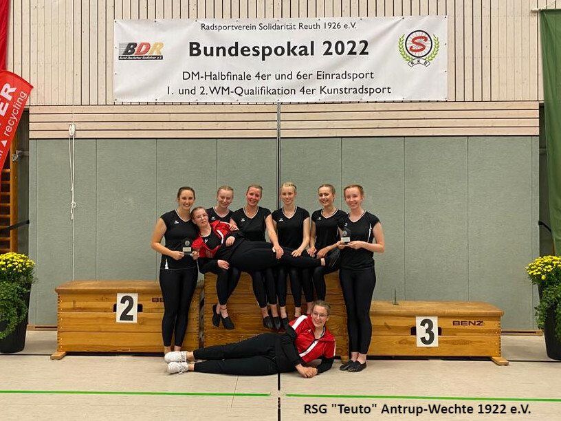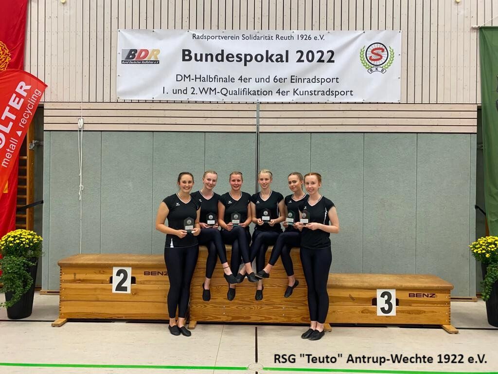 Bereits am vergangenen Freitag ging es für die 10 Sportlerinnen der RSG Teuto Antrup-Wechte und ihrer Trainerinnen in das 500km entfernte Weißenbrunn. Dort fand der diesjährige Bundespokal im Einradsport statt, der ebenfalls die Qualifikation für die Deutschen Meisterschaften darstellt. Alle drei Mannschaften, die für die RSG in diesem Jahr an den Start gehen, bestreiten in diesen Formationen ihr erstes Wettkampfjahr. Für Antrup Wechte gingen 4er 11: Jana Haverkamp, Janine Wöhler, Sophia Groß, Alexandra Sadowski, 4er 12: Carina Cittrich, Lara Uhlenbusch, Evelyne Steinmetz, Lena Dieckmann und der 6er mit Carina Cittrich, Lara Uhlenbusch, Lena Dieckmann, Lea Haarlammert, Alexandra Sadowski und Rebecca Bünte an den Start. Die Konkurrenz aus ganz Deutschland war in diesem Jahr besonders stark. Aus insgesamt 26 4er Mannschaften, konnten sich nur die besten 18 einen Platz auf der Deutschen Meisterschaft sichern, in der 6er Klasse schafften es die besten 8 aus insgesamt 14 Mannschaften.