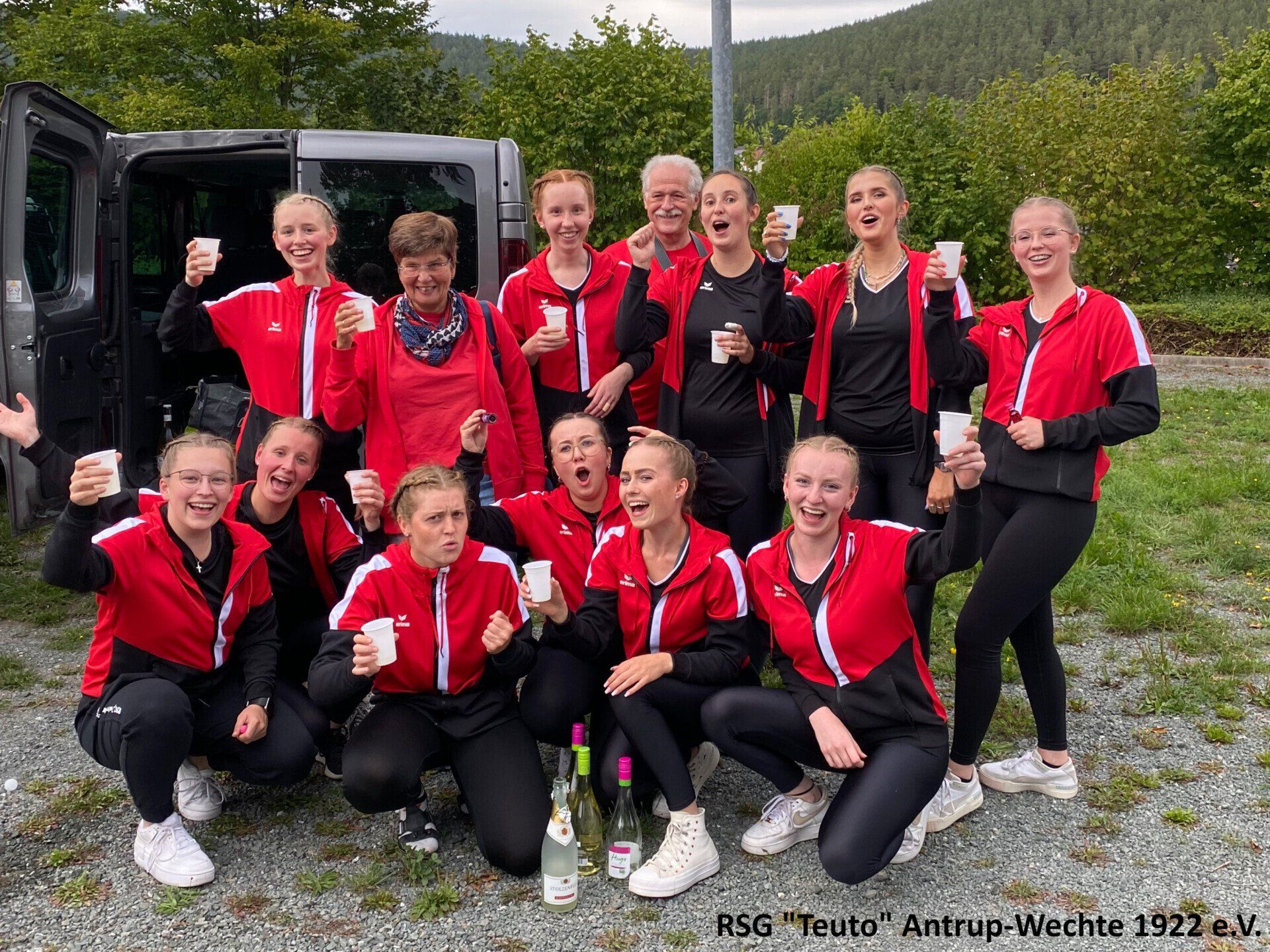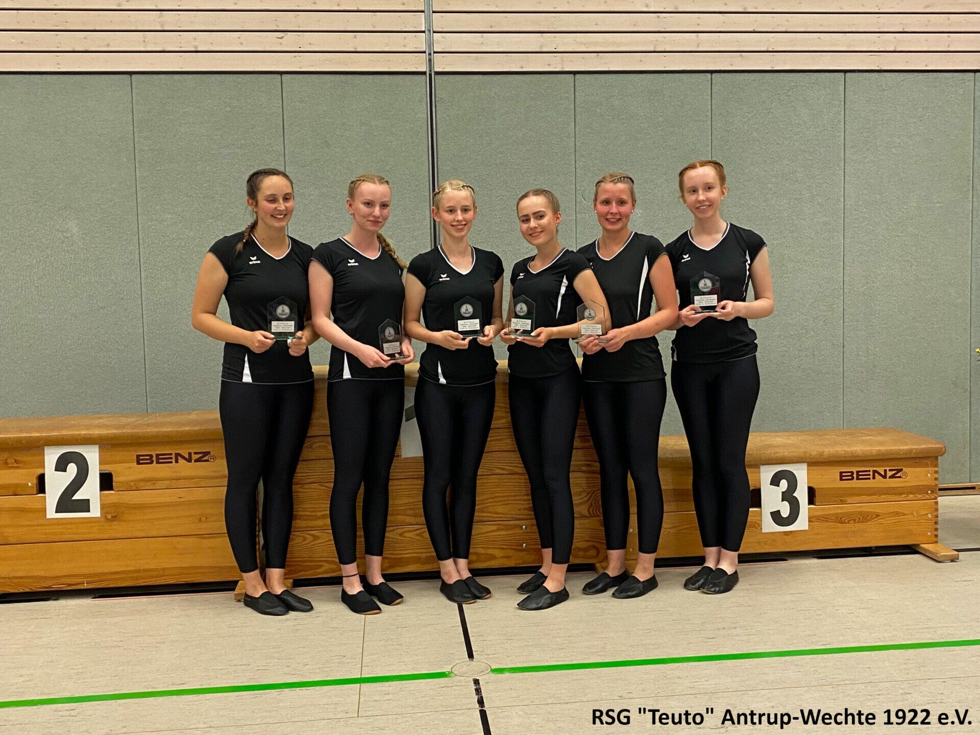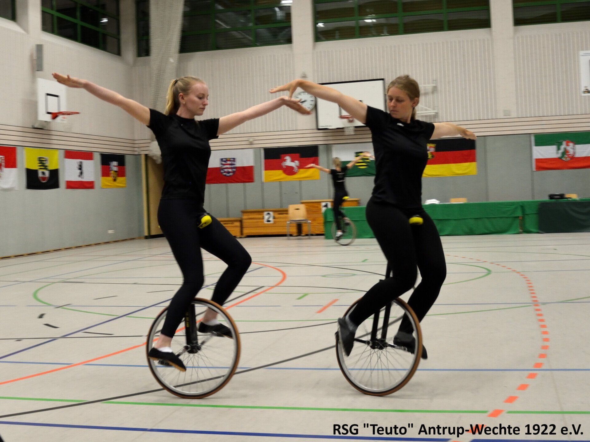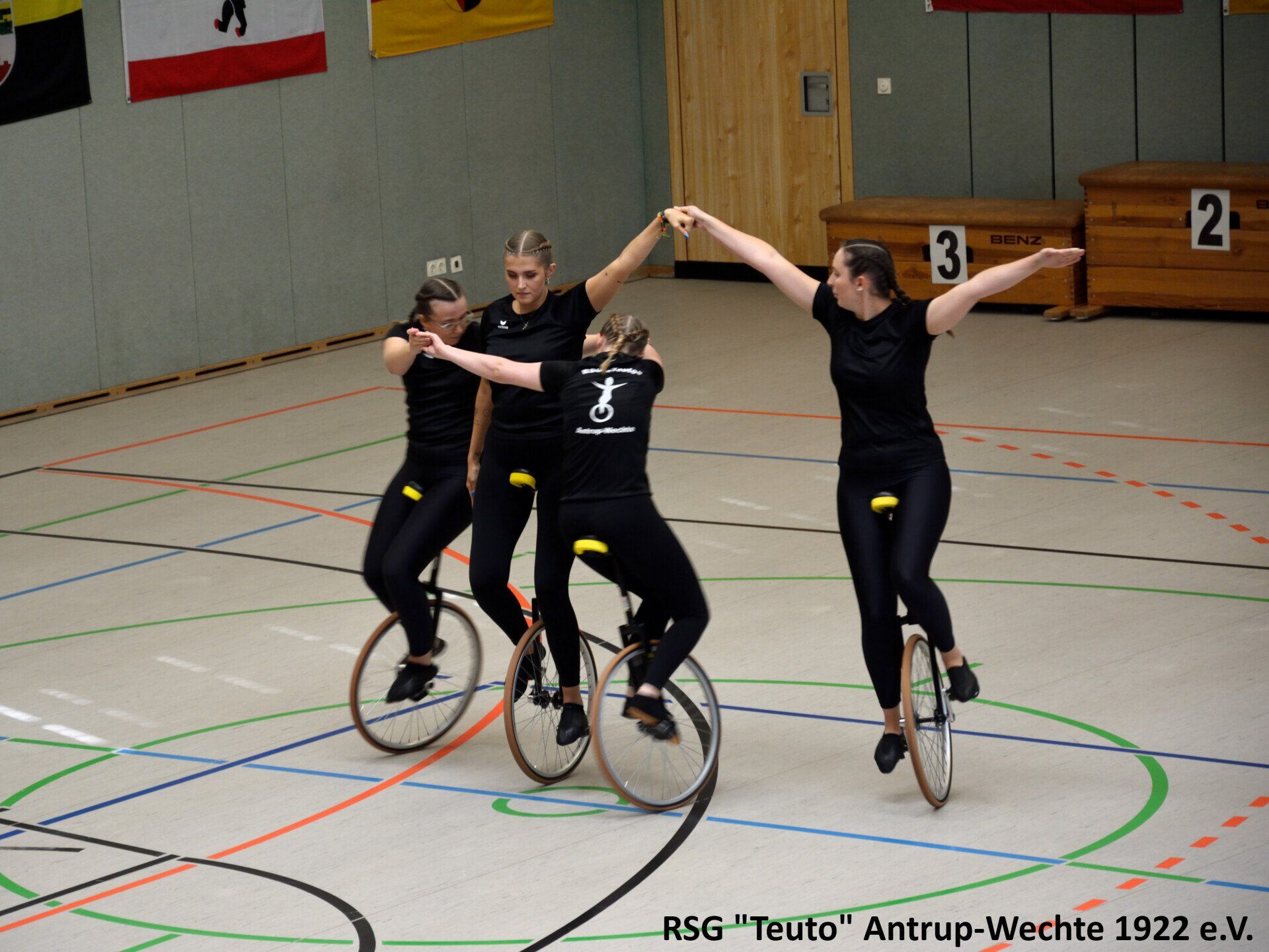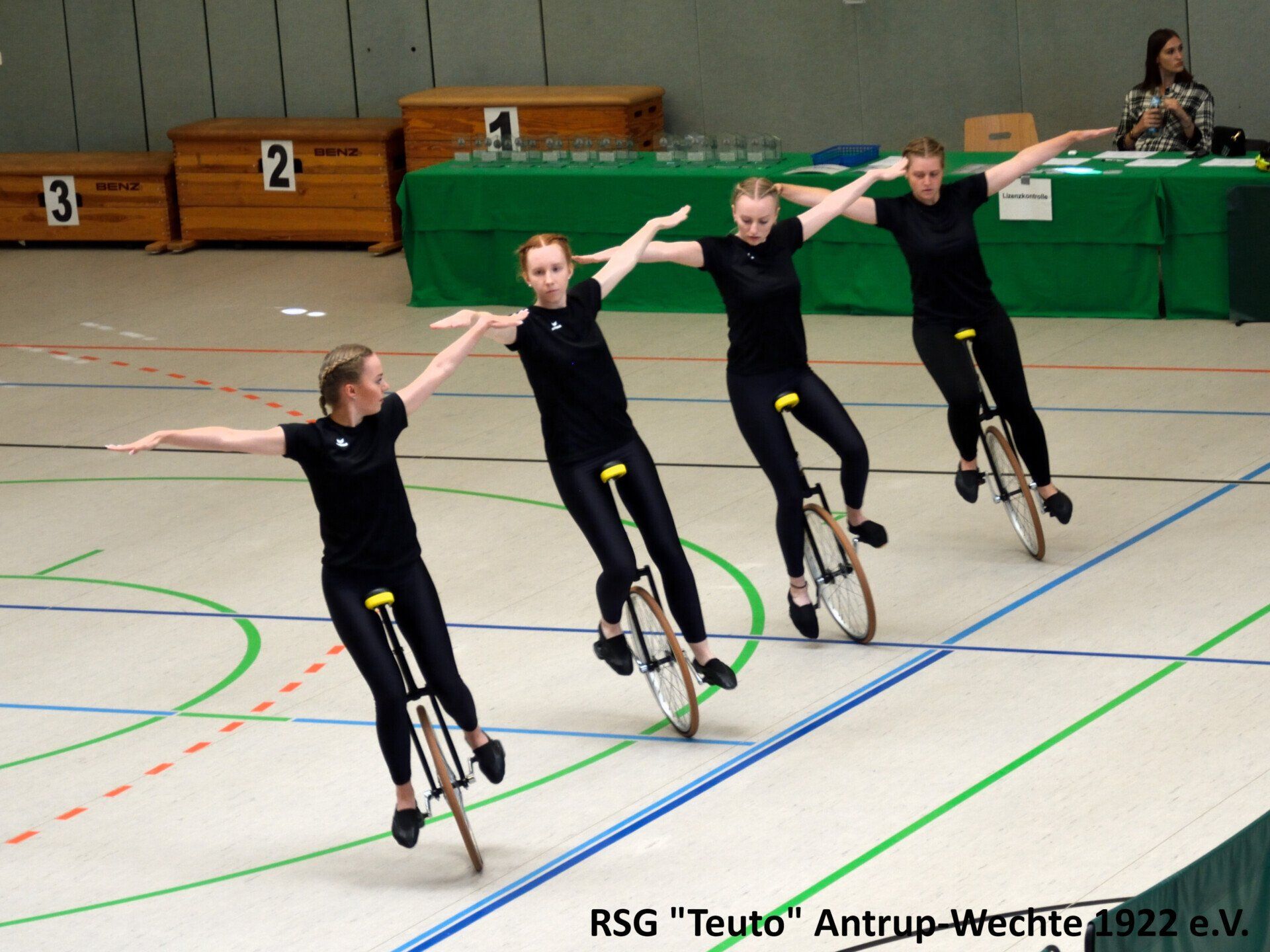 Bereits am vergangenen Freitag ging es für die 10 Sportlerinnen der RSG Teuto Antrup-Wechte und ihrer Trainerinnen in das 500km entfernte Weißenbrunn. Dort fand der diesjährige Bundespokal im Einradsport statt, der ebenfalls die Qualifikation für die Deutschen Meisterschaften darstellt. Alle drei Mannschaften, die für die RSG in diesem Jahr an den Start gehen, bestreiten in diesen Formationen ihr erstes Wettkampfjahr. Für Antrup Wechte gingen 4er 11: Jana Haverkamp, Janine Wöhler, Sophia Groß, Alexandra Sadowski, 4er 12: Carina Cittrich, Lara Uhlenbusch, Evelyne Steinmetz, Lena Dieckmann und der 6er mit Carina Cittrich, Lara Uhlenbusch, Lena Dieckmann, Lea Haarlammert, Alexandra Sadowski und Rebecca Bünte an den Start. Die Konkurrenz aus ganz Deutschland war in diesem Jahr besonders stark. Aus insgesamt 26 4er Mannschaften, konnten sich nur die besten 18 einen Platz auf der Deutschen Meisterschaft sichern, in der 6er Klasse schafften es die besten 8 aus insgesamt 14 Mannschaften.