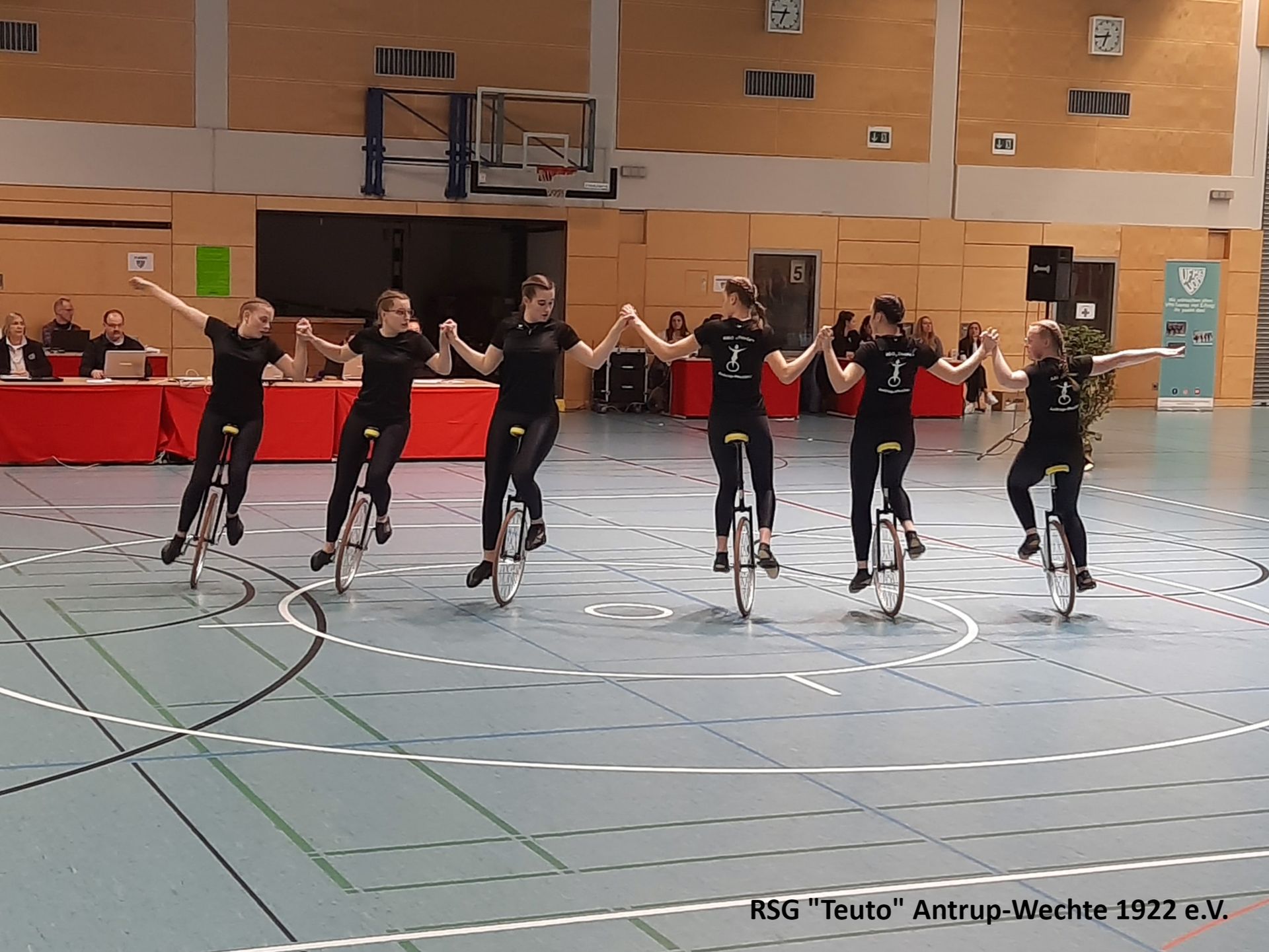 Um 18.30 Uhr begann die Finalveranstaltung. Die Mädels waren nun schon seit mehr als 10 Stunden auf den Beinen. Trotzdem wollten sie nun nochmal ihr Können unter Beweis stellen. Die erste Kategorie war der 6er Einradsport. Dort durfte die RSG Mannschaft nach der Mannschaft aus Mörfelden an den Start gehen. Die Mädels präsentieren eine wirklich tolle Kür, mit kleinsten Unsicherheiten. Die Mannschaft zeigte über die 5 minütige Kür hinweg, was in ihnen steckt. Am Ende sagte das dann auch die ausgefahrene Punktzahl von 125,34 Punkten aus. 20 Punkte mehr, als noch beim Auftritt am morgen. Nun folgte die Mannschaft aus Aach. Die Sportler/innen präsentierten sich in einer sehr guten Form und durften sich mit 135,67 Punkten über den ersten Platz freuen. Der zweite Platz ging mit einem Vorsprung von mehr als 30 Punkten zum Drittplatzierten an die Mädels der RSG. Die Freude von Sina Lindemann, Birte Aufderhaar, Juli Reiffenschneider, Laura Schröer, Janne Hackmann und Kirsten Akamp war groß! Auch die mitgereisten Trainerinnen Lena Dieckmann, Lisa Hunnewinkel und Alexandra Sadowski freuten sich sehr. Nun geben die Mädels in den nächsten Wochen gemeinsam mit ihren Trainerinnen nochmal alles, um die letzten Unsicherheiten in ihrer Kür hoffentlich beseitigen zu können.