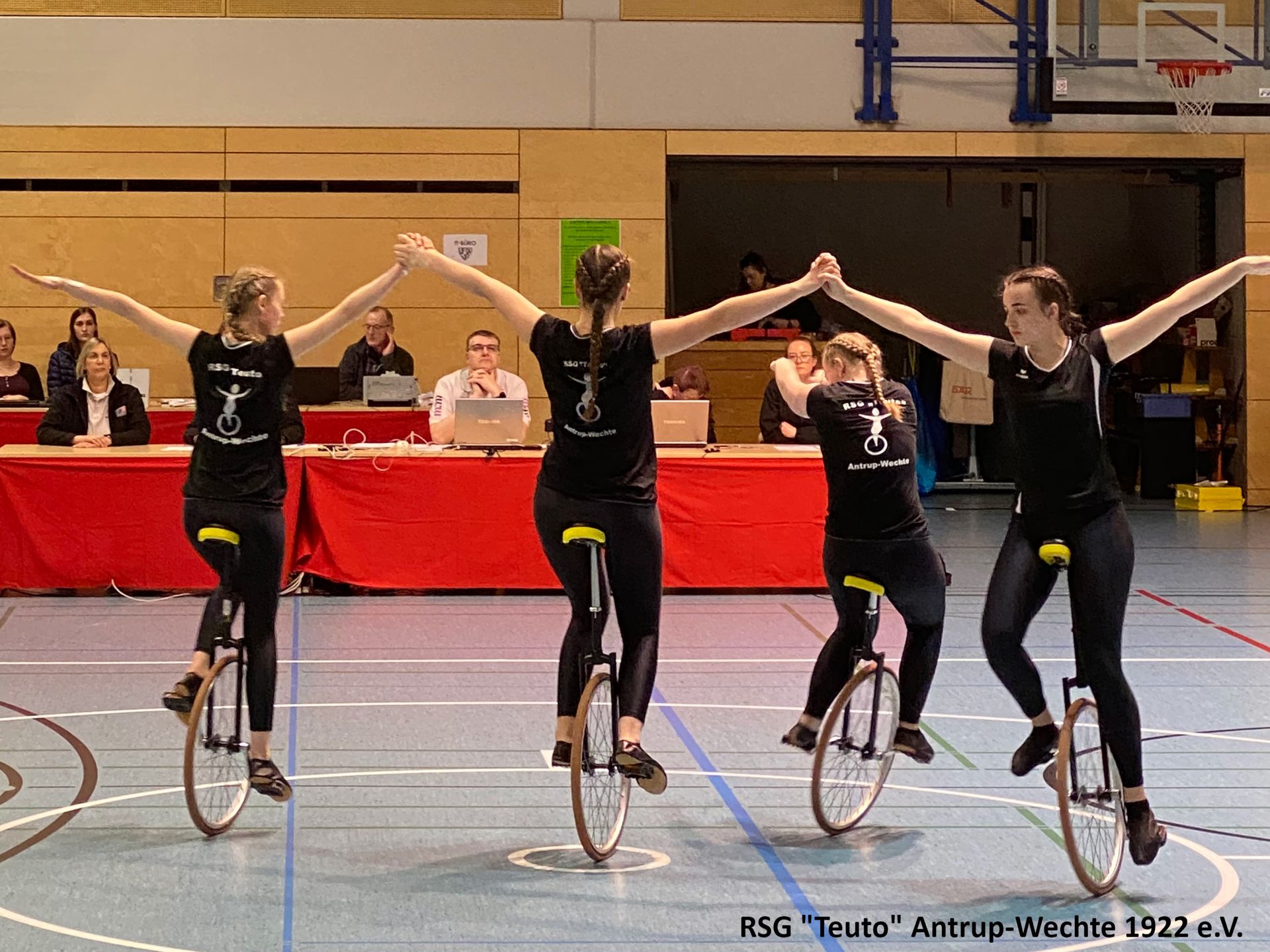 Am Samstagmorgen begann der Wettkampf mit den 6er Einradmannschaften der Junioren. Die RSG ging mit Kirsten Akamp, Juli Reiffenschneider, Janne Hackmann, Birte Aufderhaar, Laura Schröer und Sina Lindemann ins Rennen. Die Mädels konnten sich mit einer sehr soliden Leistung den zweiten Platz mit 105 Punkten hinter der Mannschaft des RMSV Edelweiß Aach sichern. Das bedeutete einerseits für die Mädels die Qualifikation zur deutschen Meisterschaft und der Einzug in die Finalveranstaltung des Junior Mannschaftscups. Damit durften die Mädels am Abend ihr Können erneut unter Beweis stellen und gegen die 1. Und 3. Platzierte Mannschaft antreten.